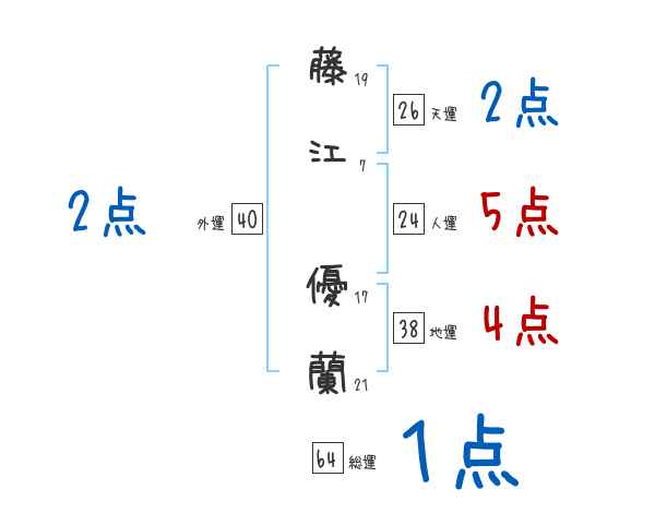 天運![]() | 藤江優蘭さんの天運は26画の2つ星!波瀾万丈かも。信頼できる人を大事にしましょう。 家系が持つ宿命的な運勢を表します。祖先から受け継いだ苗字ですので自分の力が及びません。家柄を象徴します。 |