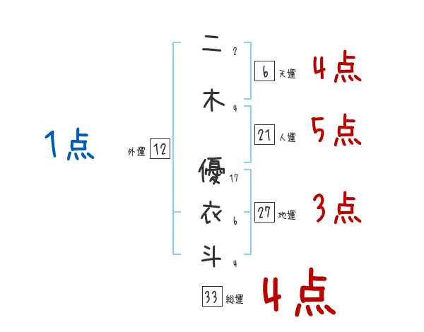 天運![]() | 二木優衣斗さんの天運は6画の4つ星!慎重な努力家で信頼を得る。誠実な精神で向上心に優れる。 家系が持つ宿命的な運勢を表します。祖先から受け継いだ苗字ですので自分の力が及びません。家柄を象徴します。 |