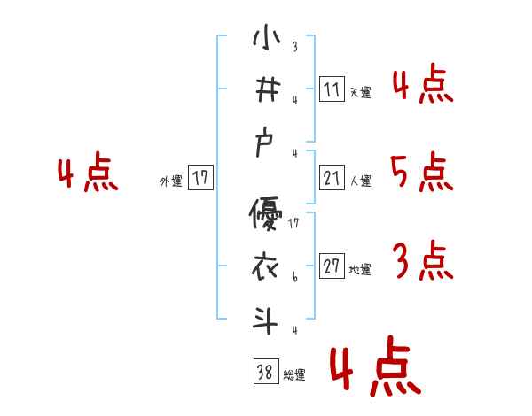 天運![]() | 小井戸優衣斗さんの天運は11画の4つ星!着実に富や地位を得る幸運な人生。 家系が持つ宿命的な運勢を表します。祖先から受け継いだ苗字ですので自分の力が及びません。家柄を象徴します。 |