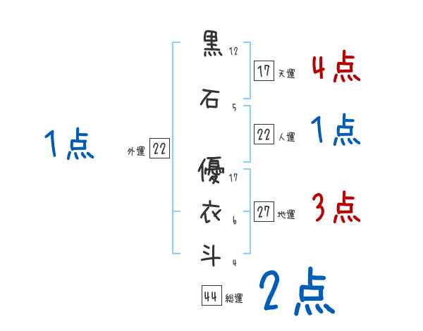 外運![]() | 黒石優衣斗さんの外運は22画の1つ星!努力することが苦手ないっぽう手先が器用。芸術性にも優れる。 生活面を象徴する運勢です。外部から受ける影響力を表し、結婚運、家庭運や職場、環境への順応性を表します。 |
