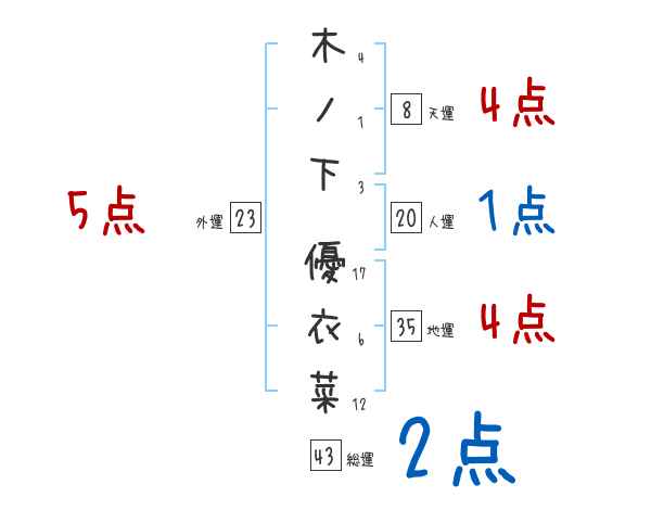 天運![]() | 木ノ下優衣菜さんの天運は8画の4つ星!勤勉家。根気強く努力し成功する。忍耐力がある。 家系が持つ宿命的な運勢を表します。祖先から受け継いだ苗字ですので自分の力が及びません。家柄を象徴します。 |