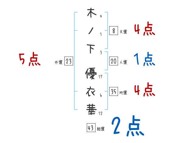 天運![]() | 木ノ下優衣華さんの天運は8画の4つ星!勤勉家。根気強く努力し成功する。忍耐力がある。 家系が持つ宿命的な運勢を表します。祖先から受け継いだ苗字ですので自分の力が及びません。家柄を象徴します。 |