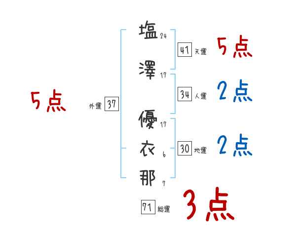 外運![]() | 塩澤優衣那さんの外運は37画の5つ星!努力家で順応性に優れる。現実的な考え方ができ忠実に物事をこなす。 生活面を象徴する運勢です。外部から受ける影響力を表し、結婚運、家庭運や職場、環境への順応性を表します。 |