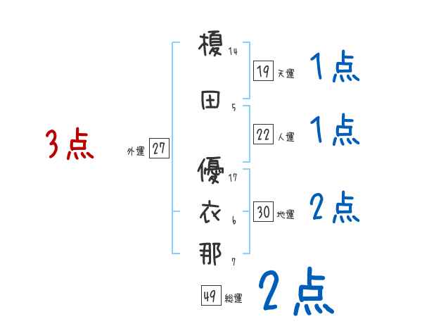 人運![]() | 榎田優衣那さんの人運は22画の1つ星!努力することが苦手ないっぽう手先が器用。芸術性にも優れる。 性格や才能などを表す2番目に重要な運勢です。人間関係や協調性、社会的な成功に影響します。主に20歳から50歳ぐらいまでの中年期の運勢を表します。 |