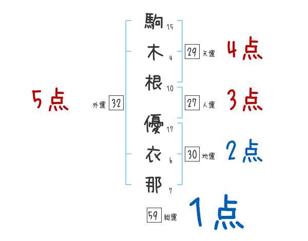 外運![]() | 駒木根優衣那さんの外運は32画の5つ星!柔軟性があり成功する。チャンスが多く金運が良い。 生活面を象徴する運勢です。外部から受ける影響力を表し、結婚運、家庭運や職場、環境への順応性を表します。 |