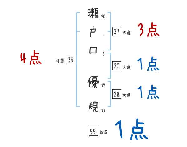 外運![]() | 瀬戸口優規さんの外運は35画の4つ星!温厚な性格で感受性が高い。穏和な性格で人望が厚い。 生活面を象徴する運勢です。外部から受ける影響力を表し、結婚運、家庭運や職場、環境への順応性を表します。 |