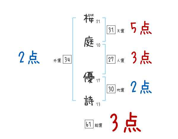 外運![]() | 桜庭優詩さんの外運は34画の2つ星!独創性に優れるが、自尊心が強く災難に注意しましょう。 生活面を象徴する運勢です。外部から受ける影響力を表し、結婚運、家庭運や職場、環境への順応性を表します。 |