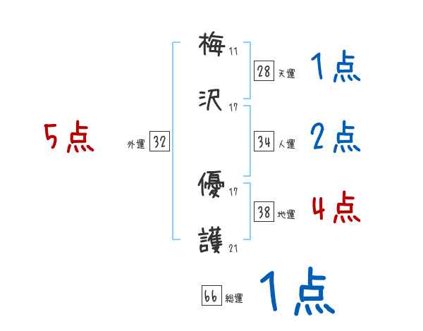 外運![]() | 梅沢優護さんの外運は32画の5つ星!柔軟性があり成功する。チャンスが多く金運が良い。 生活面を象徴する運勢です。外部から受ける影響力を表し、結婚運、家庭運や職場、環境への順応性を表します。 |