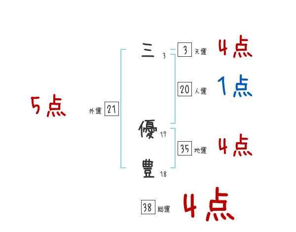 天運![]() | 三優豊さんの天運は3画の4つ星!活動的で才能に恵まれ、多くの信頼を得る。希望に満ち成長する。 家系が持つ宿命的な運勢を表します。祖先から受け継いだ苗字ですので自分の力が及びません。家柄を象徴します。 |