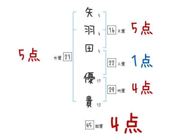 天運![]() | 矢羽田優貴さんの天運は16画の5つ星!人望が厚く大きく発展する。逆転成功が見える。 家系が持つ宿命的な運勢を表します。祖先から受け継いだ苗字ですので自分の力が及びません。家柄を象徴します。 |