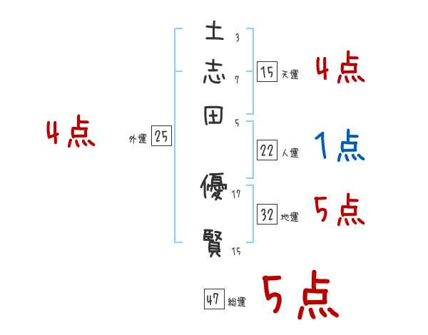 総運![]() | 土志田優賢さんの総運は47画の5つ星!実力が開花し発展する円満な人生。財に恵まれる。 あなたの人生を表す1番重要な運勢です。生涯を通じて影響する総合運となり、主に50歳以降の晩年期に影響を及ぼします。 |
