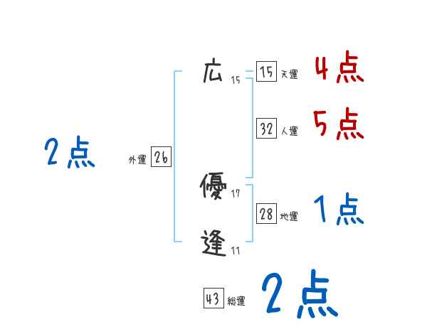人運![]() | 広優逢さんの人運は32画の5つ星!柔軟性があり成功する。チャンスが多く金運が良い。 性格や才能などを表す2番目に重要な運勢です。人間関係や協調性、社会的な成功に影響します。主に20歳から50歳ぐらいまでの中年期の運勢を表します。 |
