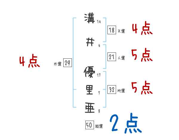 外運![]() | 溝井優里亜さんの外運は29画の4つ星!完全主義で才能がある。厳格な心の持ち主。 生活面を象徴する運勢です。外部から受ける影響力を表し、結婚運、家庭運や職場、環境への順応性を表します。 |