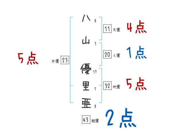 天運![]() | 八山優里亜さんの天運は11画の4つ星!着実に富や地位を得る幸運な人生。 家系が持つ宿命的な運勢を表します。祖先から受け継いだ苗字ですので自分の力が及びません。家柄を象徴します。 |