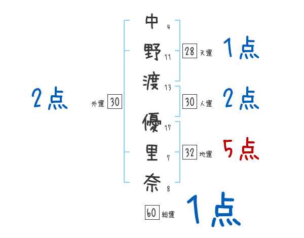 外運![]() | 中野渡優里奈さんの外運は30画の2つ星!浮き沈みの激しさに注意しましょう。 生活面を象徴する運勢です。外部から受ける影響力を表し、結婚運、家庭運や職場、環境への順応性を表します。 |