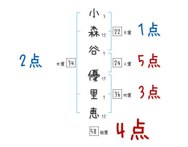 外運![]() | 小森谷優里恵さんの外運は34画の2つ星!独創性に優れるが、自尊心が強く災難に注意しましょう。 生活面を象徴する運勢です。外部から受ける影響力を表し、結婚運、家庭運や職場、環境への順応性を表します。 |