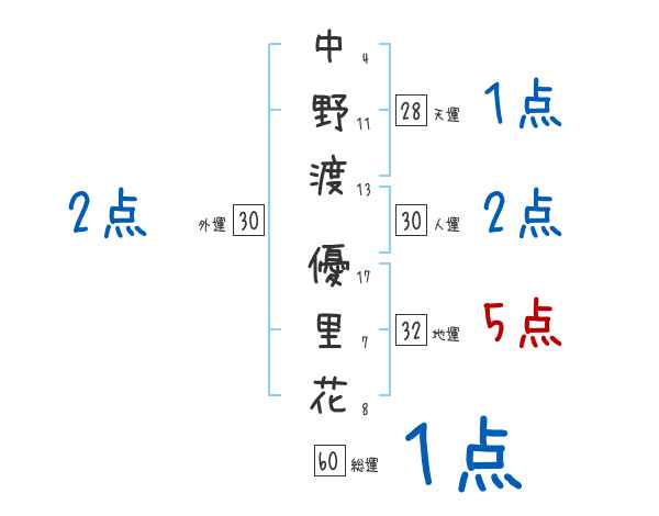 総運![]() | 中野渡優里花さんの総運は60画の1つ星!悲観的で迷いやすい。波乱が多く損をしないように。 あなたの人生を表す1番重要な運勢です。生涯を通じて影響する総合運となり、主に50歳以降の晩年期に影響を及ぼします。 |