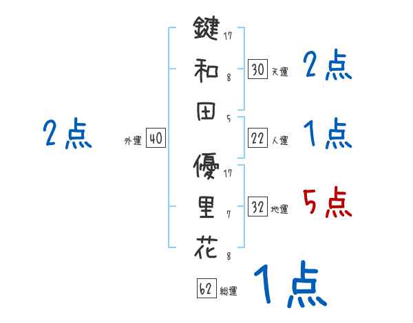 天運![]() | 鍵和田優里花さんの天運は30画の2つ星!浮き沈みの激しさに注意しましょう。 家系が持つ宿命的な運勢を表します。祖先から受け継いだ苗字ですので自分の力が及びません。家柄を象徴します。 |