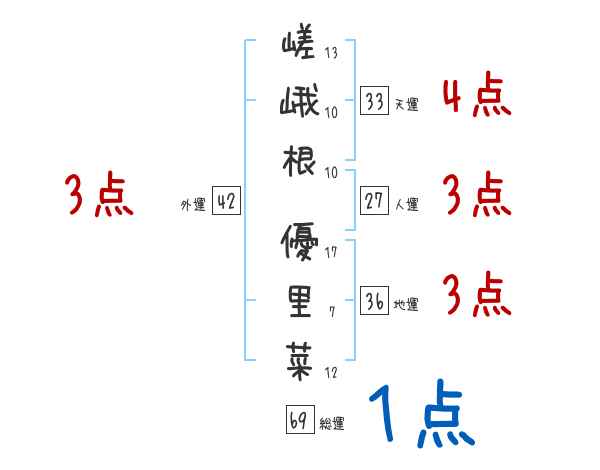 総運![]() | 嵯峨根優里菜さんの総運は69画の1つ星!不満を感じやすい傾向が。ストレスを貯めないように注意しましょう。 あなたの人生を表す1番重要な運勢です。生涯を通じて影響する総合運となり、主に50歳以降の晩年期に影響を及ぼします。 |