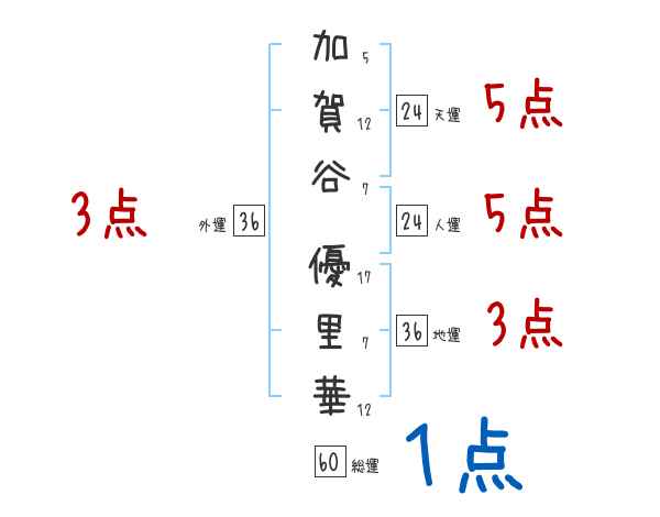 天運![]() | 加賀谷優里華さんの天運は24画の5つ星!家庭運が良く順調な人生。金運にも恵まれる。 家系が持つ宿命的な運勢を表します。祖先から受け継いだ苗字ですので自分の力が及びません。家柄を象徴します。 |