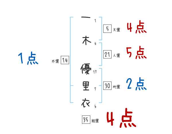 天運![]() | 一木優里衣さんの天運は5画の4つ星!健康で安泰。協調性に優れ、財産に恵まれる。 家系が持つ宿命的な運勢を表します。祖先から受け継いだ苗字ですので自分の力が及びません。家柄を象徴します。 |