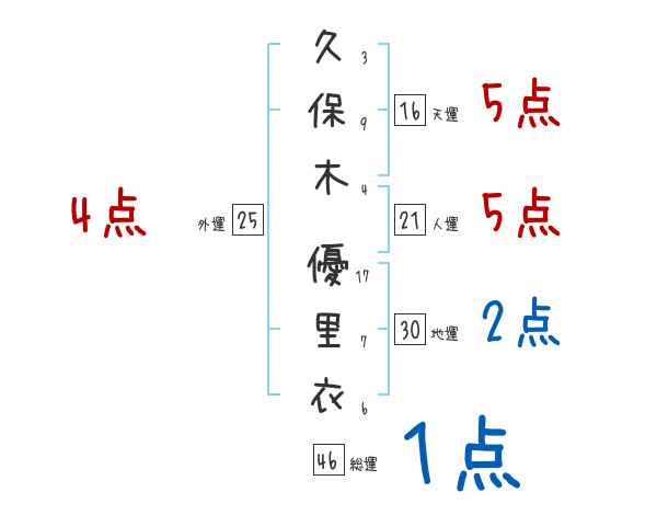総運![]() | 久保木優里衣さんの総運は46画の1つ星!迷走することが多く苦労するかも。目先のことにとらわれないように。 あなたの人生を表す1番重要な運勢です。生涯を通じて影響する総合運となり、主に50歳以降の晩年期に影響を及ぼします。 |