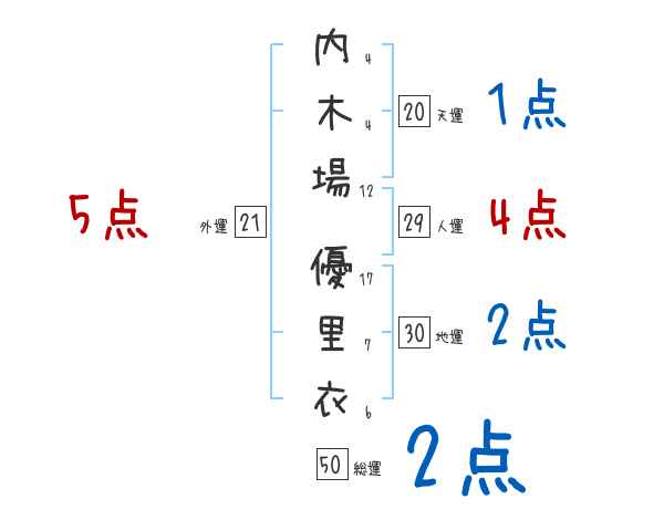 外運![]() | 内木場優里衣さんの外運は21画の5つ星!統率力がある。独立し成功する。名誉を手に入れる。 生活面を象徴する運勢です。外部から受ける影響力を表し、結婚運、家庭運や職場、環境への順応性を表します。 |