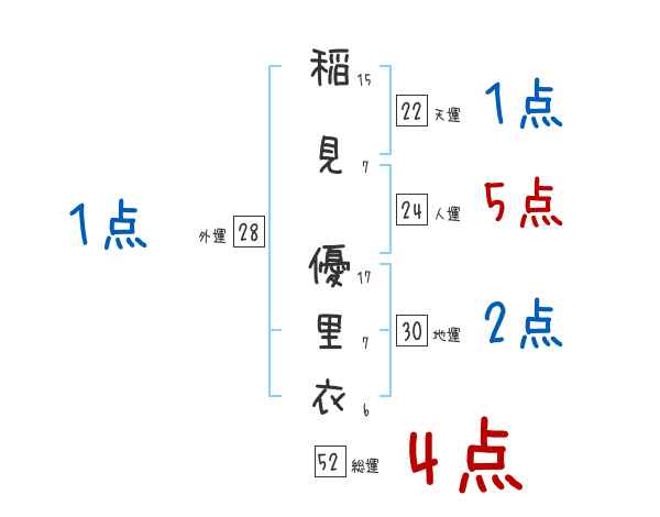 天運![]() | 稲見優里衣さんの天運は22画の1つ星!努力することが苦手ないっぽう手先が器用。芸術性にも優れる。 家系が持つ宿命的な運勢を表します。祖先から受け継いだ苗字ですので自分の力が及びません。家柄を象徴します。 |