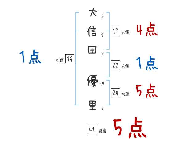 外運![]() | 大信田優里さんの外運は19画の1つ星!優れた才能を持ちますが、協調性が足りないことも。周りの人と協力する事を意識しましょう。 生活面を象徴する運勢です。外部から受ける影響力を表し、結婚運、家庭運や職場、環境への順応性を表します。 |