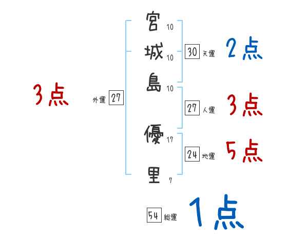天運![]() | 宮城島優里さんの天運は30画の2つ星!浮き沈みの激しさに注意しましょう。 家系が持つ宿命的な運勢を表します。祖先から受け継いだ苗字ですので自分の力が及びません。家柄を象徴します。 |