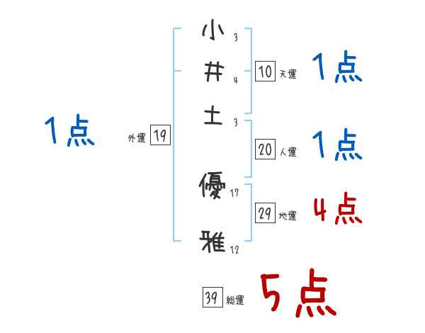 外運![]() | 小井土優雅さんの外運は19画の1つ星!優れた才能を持ちますが、協調性が足りないことも。周りの人と協力する事を意識しましょう。 生活面を象徴する運勢です。外部から受ける影響力を表し、結婚運、家庭運や職場、環境への順応性を表します。 |