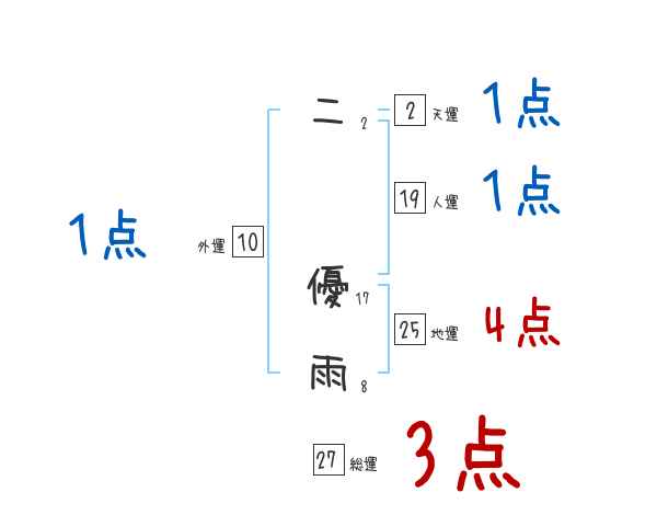 人運![]() | 二優雨さんの人運は19画の1つ星!優れた才能を持ちますが、協調性が足りないことも。周りの人と協力する事を意識しましょう。 性格や才能などを表す2番目に重要な運勢です。人間関係や協調性、社会的な成功に影響します。主に20歳から50歳ぐらいまでの中年期の運勢を表します。 |