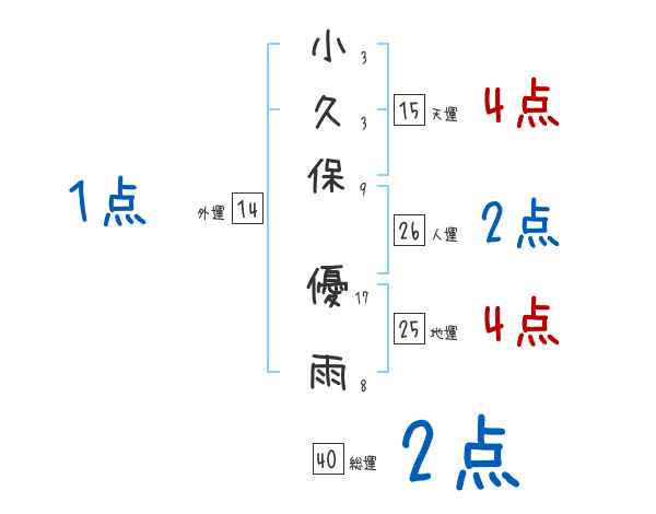 外運![]() | 小久保優雨さんの外運は14画の1つ星!人に対して優しいがストレスを溜め込みがち。人間関係のトラブルを避けるよう気をつけましょう。 生活面を象徴する運勢です。外部から受ける影響力を表し、結婚運、家庭運や職場、環境への順応性を表します。 |