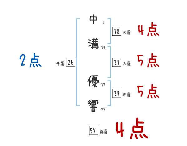 総運![]() | 中溝優響さんの総運は57画の4つ星!向上心があり人望がある。地位を得る。 あなたの人生を表す1番重要な運勢です。生涯を通じて影響する総合運となり、主に50歳以降の晩年期に影響を及ぼします。 |