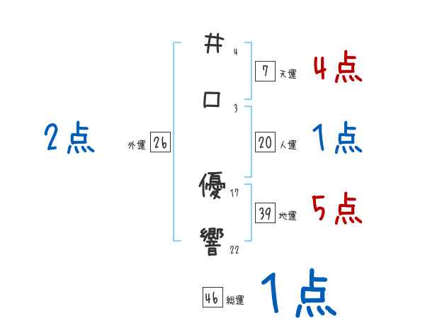 天運![]() | 井口優響さんの天運は7画の4つ星!強い意志や信念を持ち独立心が強い。自立する。 家系が持つ宿命的な運勢を表します。祖先から受け継いだ苗字ですので自分の力が及びません。家柄を象徴します。 |