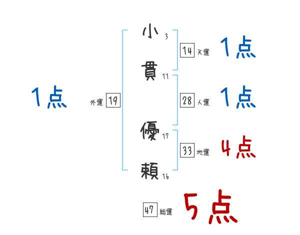 天運![]() | 小貫優頼さんの天運は14画の1つ星!人に対して優しいがストレスを溜め込みがち。人間関係のトラブルを避けるよう気をつけましょう。 家系が持つ宿命的な運勢を表します。祖先から受け継いだ苗字ですので自分の力が及びません。家柄を象徴します。 |