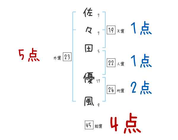外運![]() | 佐々田優風さんの外運は23画の5つ星!想像力に優れ活力がある。一代で成功し名誉を手に入れる。 生活面を象徴する運勢です。外部から受ける影響力を表し、結婚運、家庭運や職場、環境への順応性を表します。 |