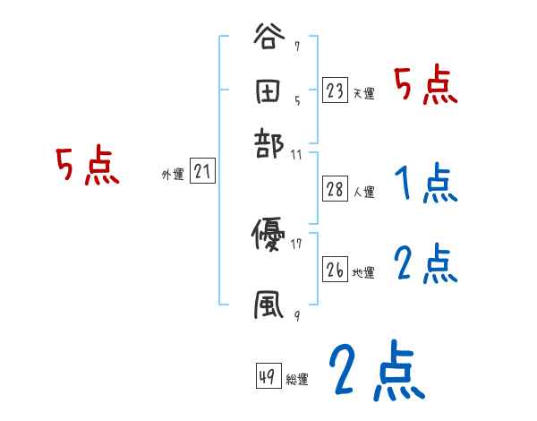天運![]() | 谷田部優風さんの天運は23画の5つ星!想像力に優れ活力がある。一代で成功し名誉を手に入れる。 家系が持つ宿命的な運勢を表します。祖先から受け継いだ苗字ですので自分の力が及びません。家柄を象徴します。 |