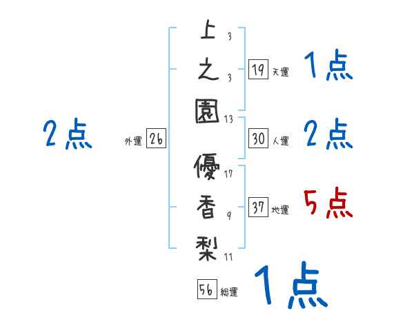 外運![]() | 上之園優香梨さんの外運は26画の2つ星!波瀾万丈かも。信頼できる人を大事にしましょう。 生活面を象徴する運勢です。外部から受ける影響力を表し、結婚運、家庭運や職場、環境への順応性を表します。 |