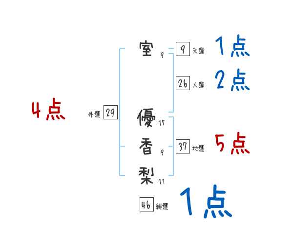 | 人運  | 室優香梨さんの人運は26画の2つ星!波瀾万丈かも。信頼できる人を大事にしましょう。性格や才能などを表す2番目に重要な運勢です。人間関係や協調性、社会的な成功に影響します。主に20歳から50歳ぐらいまでの中年期の運勢を表します。 |