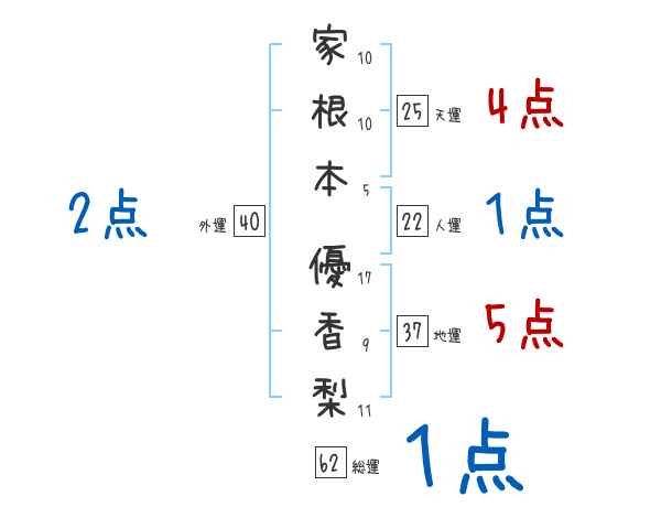 外運![]() | 家根本優香梨さんの外運は40画の2つ星!自信過剰で物事に固執するためトラブルに注意。 生活面を象徴する運勢です。外部から受ける影響力を表し、結婚運、家庭運や職場、環境への順応性を表します。 |