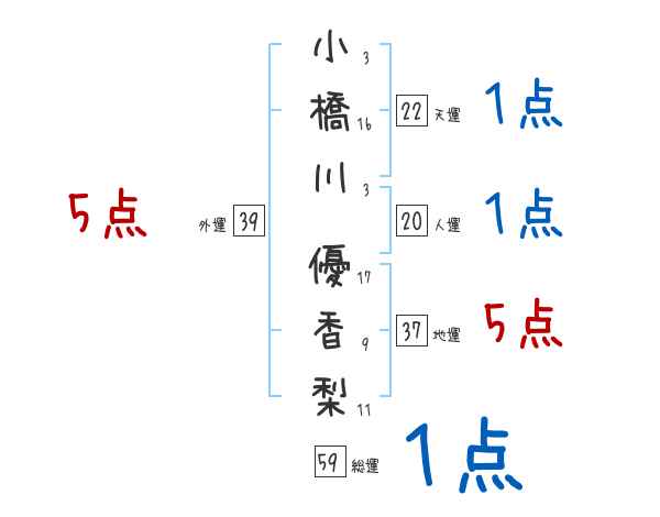 外運![]() | 小橋川優香梨さんの外運は39画の5つ星!社交性に優れ人望が厚い。人の上に立ち成功する。 生活面を象徴する運勢です。外部から受ける影響力を表し、結婚運、家庭運や職場、環境への順応性を表します。 |