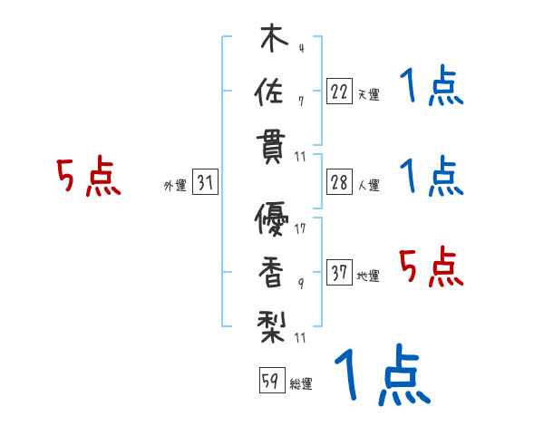 総運![]() | 木佐貫優香梨さんの総運は59画の1つ星!意志の弱さであきらめることが多いかも。粘り強さが必要。 あなたの人生を表す1番重要な運勢です。生涯を通じて影響する総合運となり、主に50歳以降の晩年期に影響を及ぼします。 |