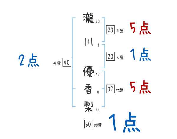 | 天運  | 瀧川優香梨さんの天運は23画の5つ星!想像力に優れ活力がある。一代で成功し名誉を手に入れる。家系が持つ宿命的な運勢を表します。祖先から受け継いだ苗字ですので自分の力が及びません。家柄を象徴します。 |