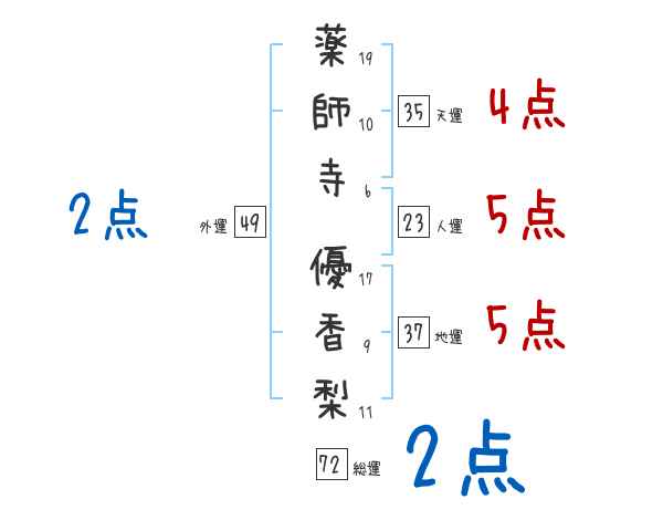 | 天運  | 薬師寺優香梨さんの天運は35画の4つ星!温厚な性格で感受性が高い。穏和な性格で人望が厚い。家系が持つ宿命的な運勢を表します。祖先から受け継いだ苗字ですので自分の力が及びません。家柄を象徴します。 |