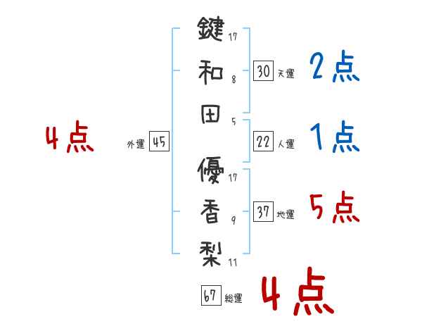人運![]() | 鍵和田優香梨さんの人運は22画の1つ星!努力することが苦手ないっぽう手先が器用。芸術性にも優れる。 性格や才能などを表す2番目に重要な運勢です。人間関係や協調性、社会的な成功に影響します。主に20歳から50歳ぐらいまでの中年期の運勢を表します。 |