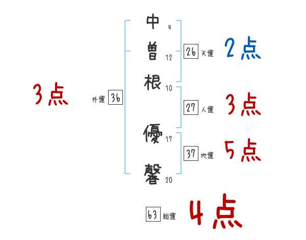 天運![]() | 中曽根優馨さんの天運は26画の2つ星!波瀾万丈かも。信頼できる人を大事にしましょう。 家系が持つ宿命的な運勢を表します。祖先から受け継いだ苗字ですので自分の力が及びません。家柄を象徴します。 |