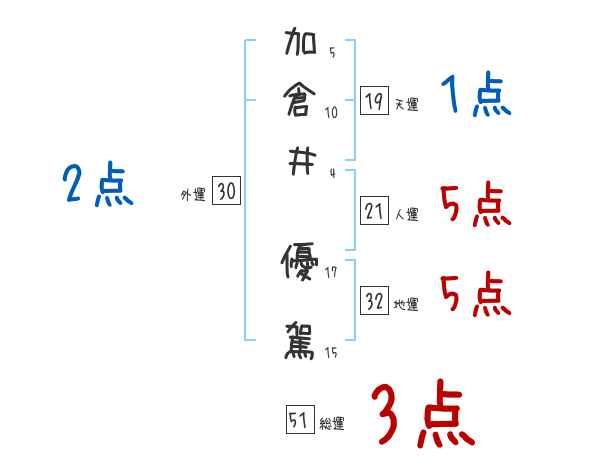 人運![]() | 加倉井優駕さんの人運は21画の5つ星!統率力がある。独立し成功する。名誉を手に入れる。 性格や才能などを表す2番目に重要な運勢です。人間関係や協調性、社会的な成功に影響します。主に20歳から50歳ぐらいまでの中年期の運勢を表します。 |
