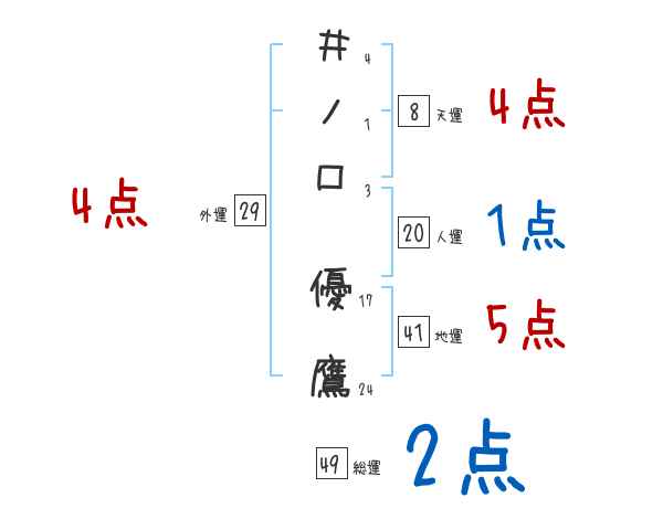 天運![]() | 井ノ口優鷹さんの天運は8画の4つ星!勤勉家。根気強く努力し成功する。忍耐力がある。 家系が持つ宿命的な運勢を表します。祖先から受け継いだ苗字ですので自分の力が及びません。家柄を象徴します。 |