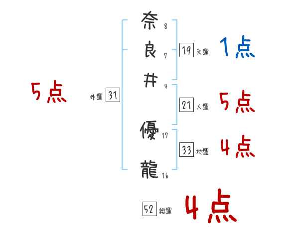 外運![]() | 奈良井優龍さんの外運は31画の5つ星!社交性があり判断力に優れる。順風満帆な人生で円満な生活。 生活面を象徴する運勢です。外部から受ける影響力を表し、結婚運、家庭運や職場、環境への順応性を表します。 |